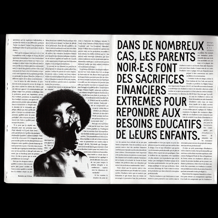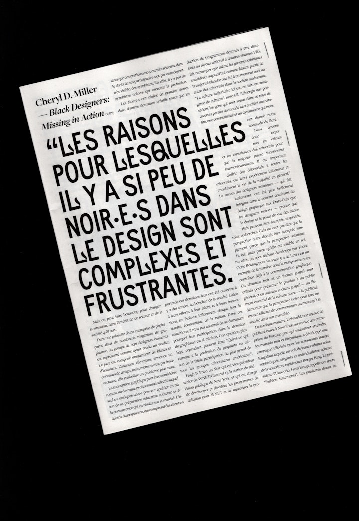 Pour mon projet de diplôme de Master au Campus Fonderie de l’Image, j’ai voulu mettre en formes et en lumière les ressources que j’ai découvertes pendant mon mémoire de recherche: ces artistes, designers, chercheur·euse·s en art noir·e·s auxquel·le·s ces disciplines doivent tant, mais qui sont absent·e·s des corpus d’études, des anthologies et souvent des institutions artistiques.